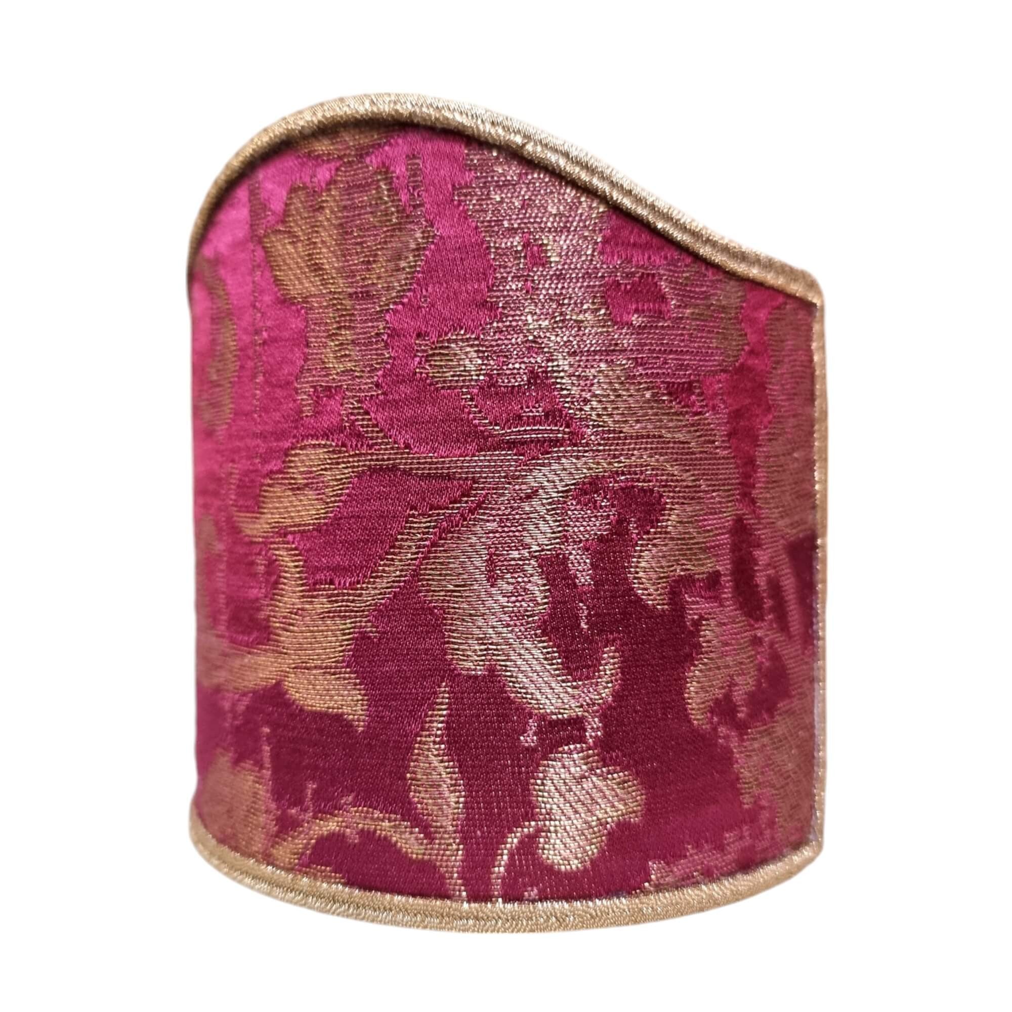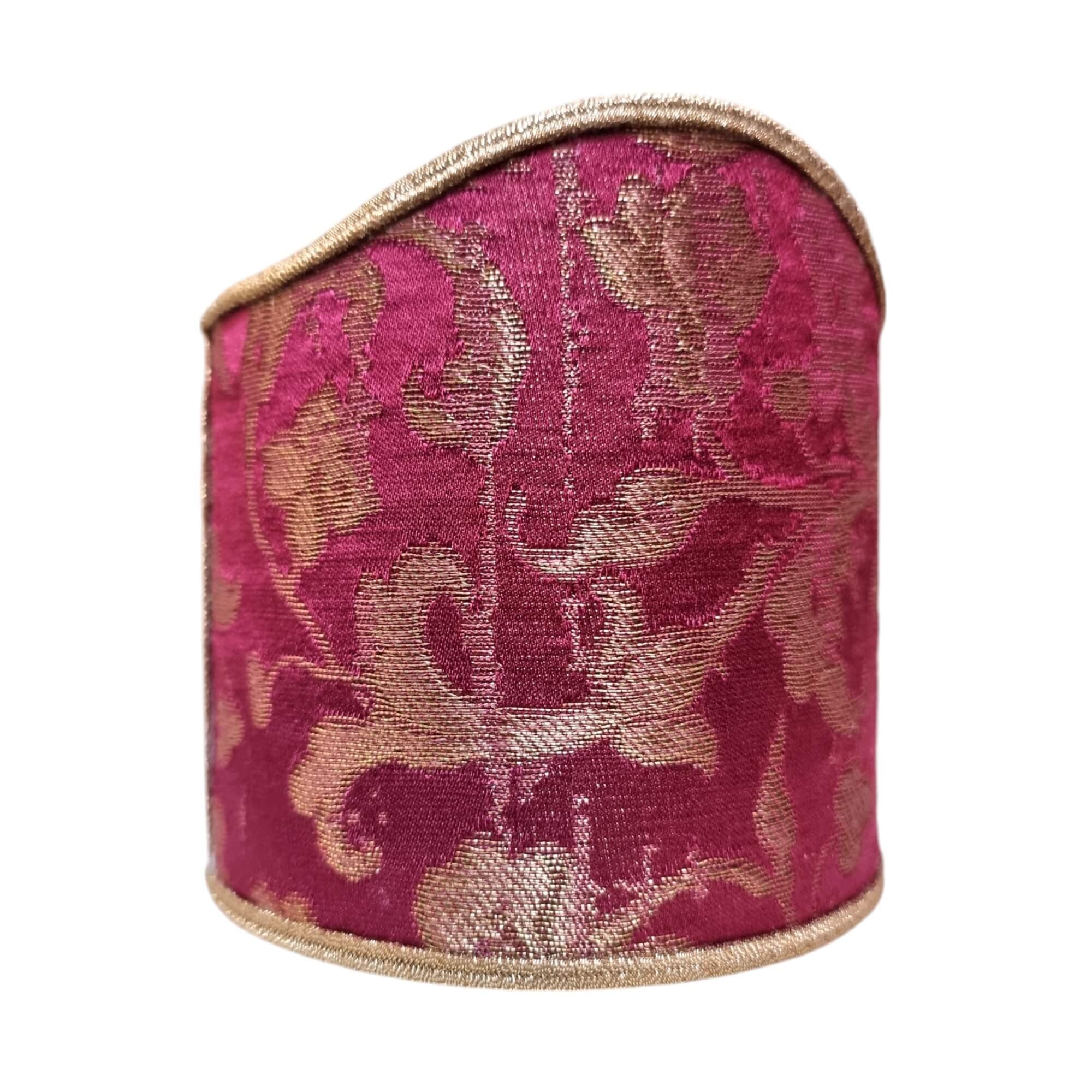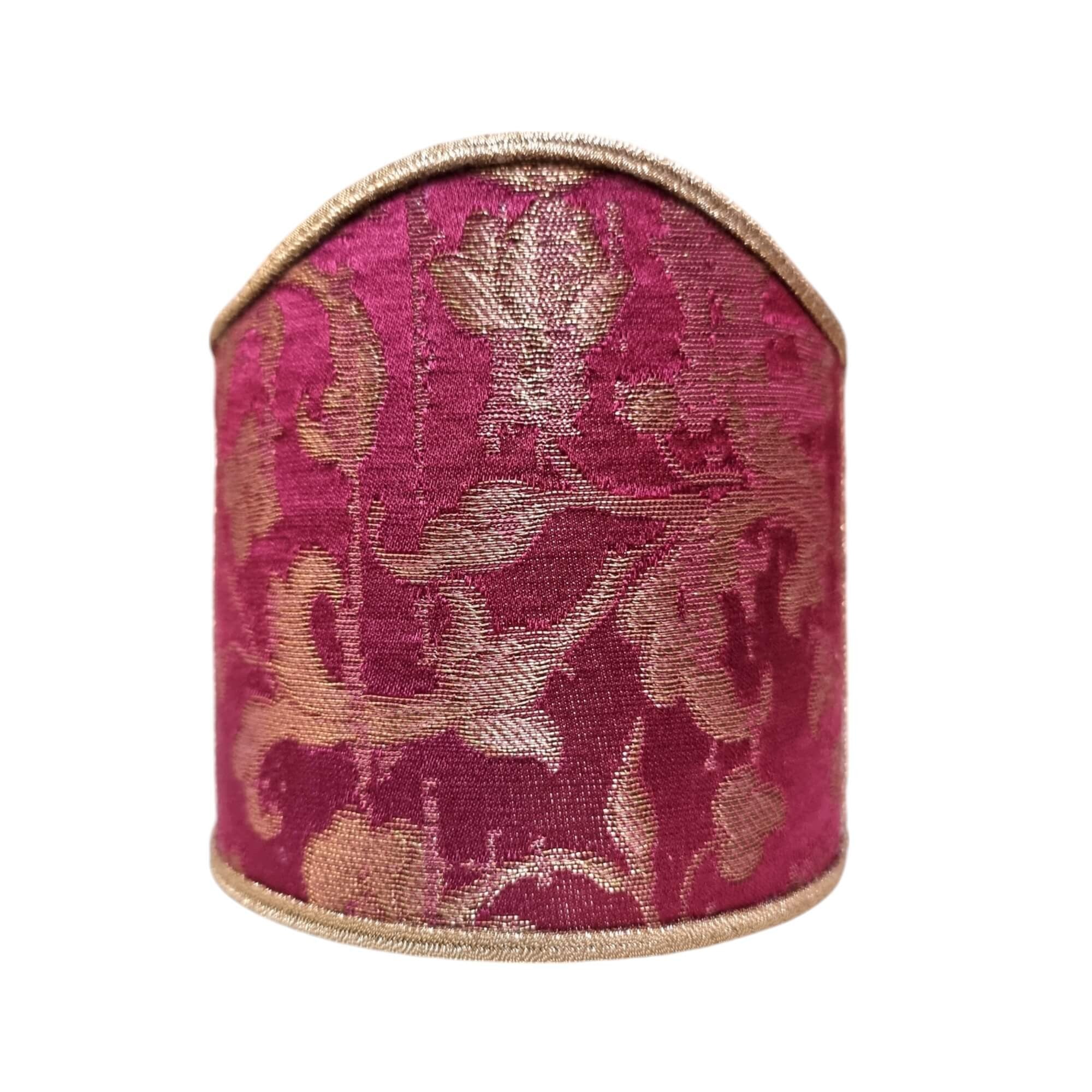 This pretty clip on lamp shade is handmade using Rubelli silk jacquard fabric - Les Indes Galantes pattern - in cardinal and gold color, finished with gold trim, with a fitting that clips over the light bulb
