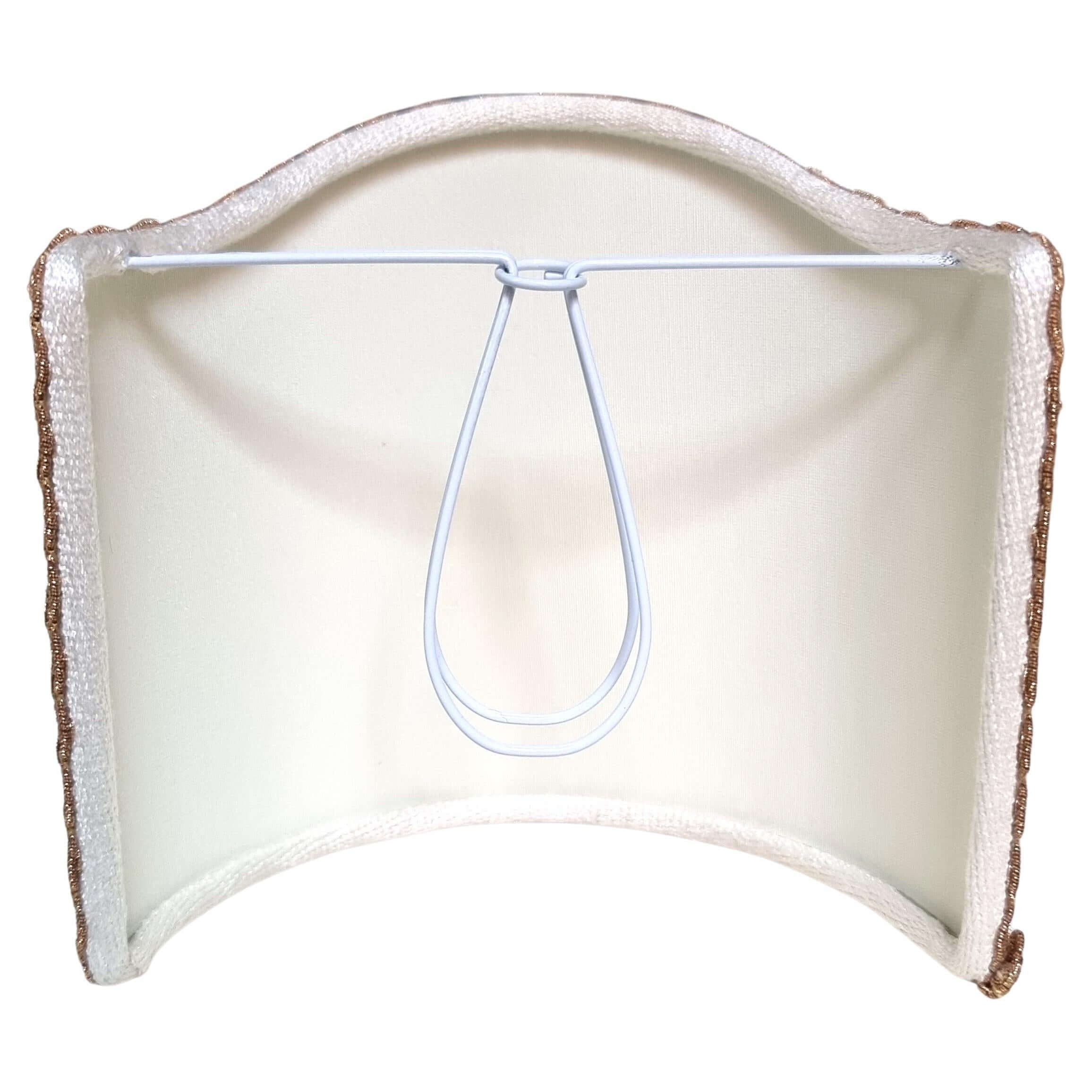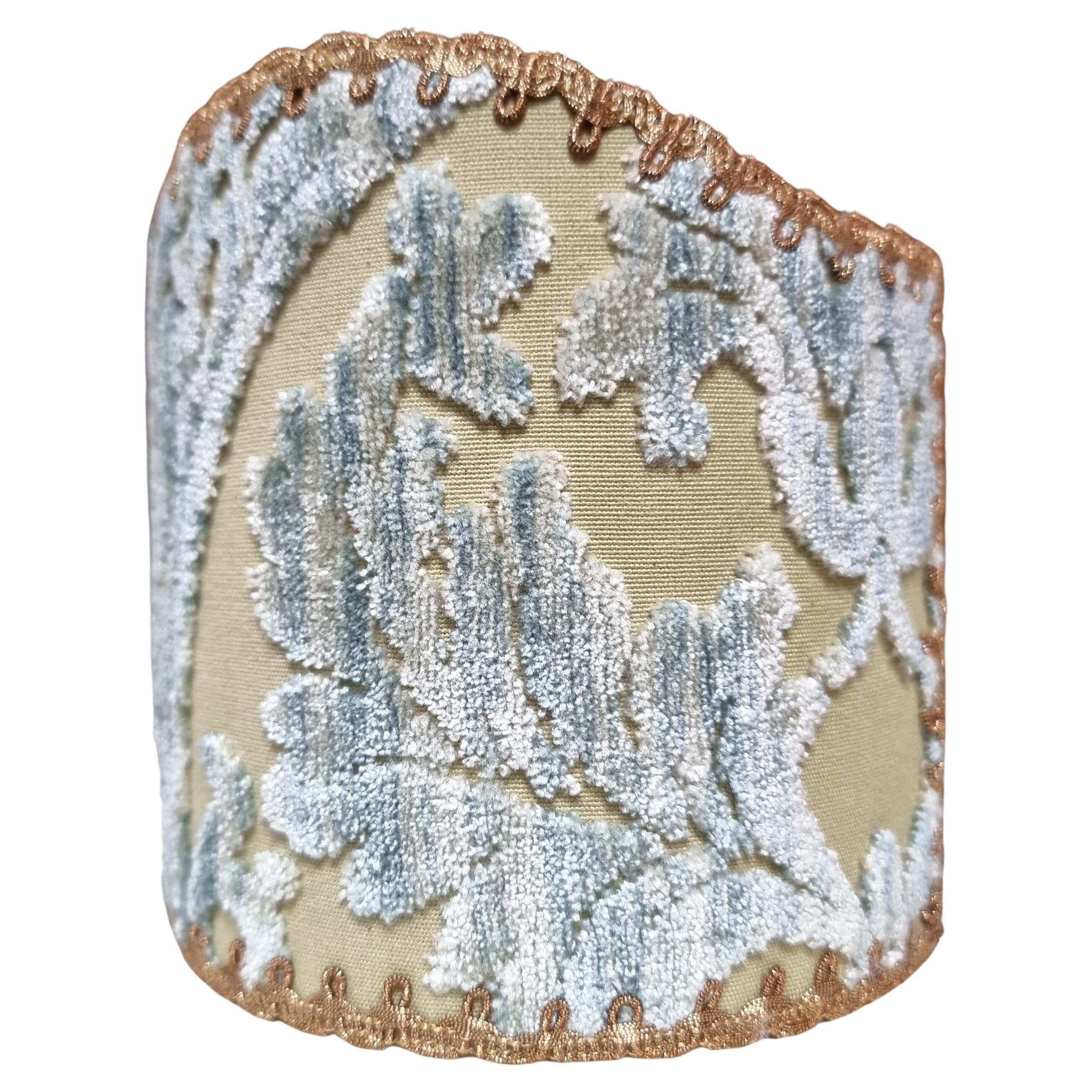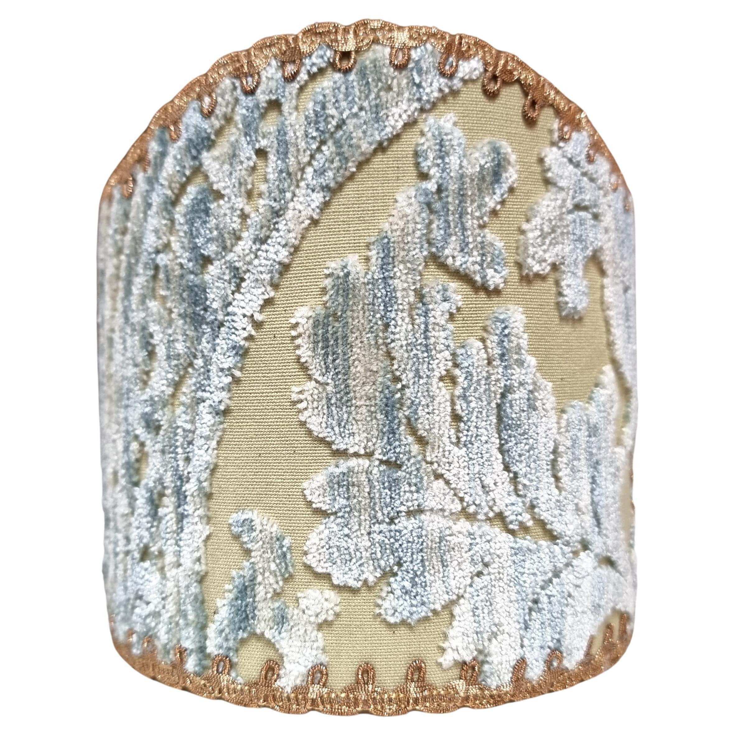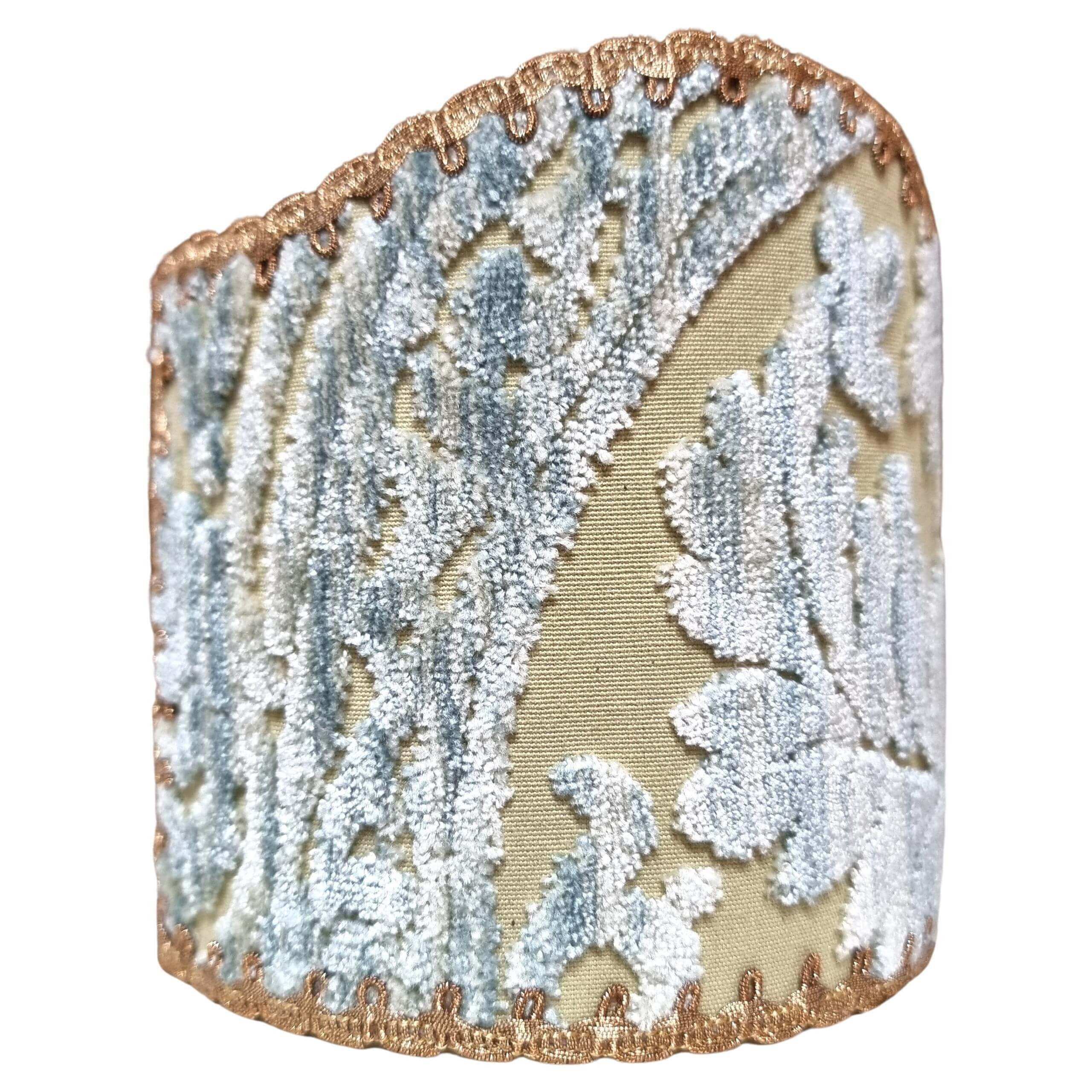 This pretty clip-on shield shade is handmade using Luigi Bevilacqua velvet Da Vinci pattern in baltic green color finished with gold trim, with a fitting that clips over the light bulb.